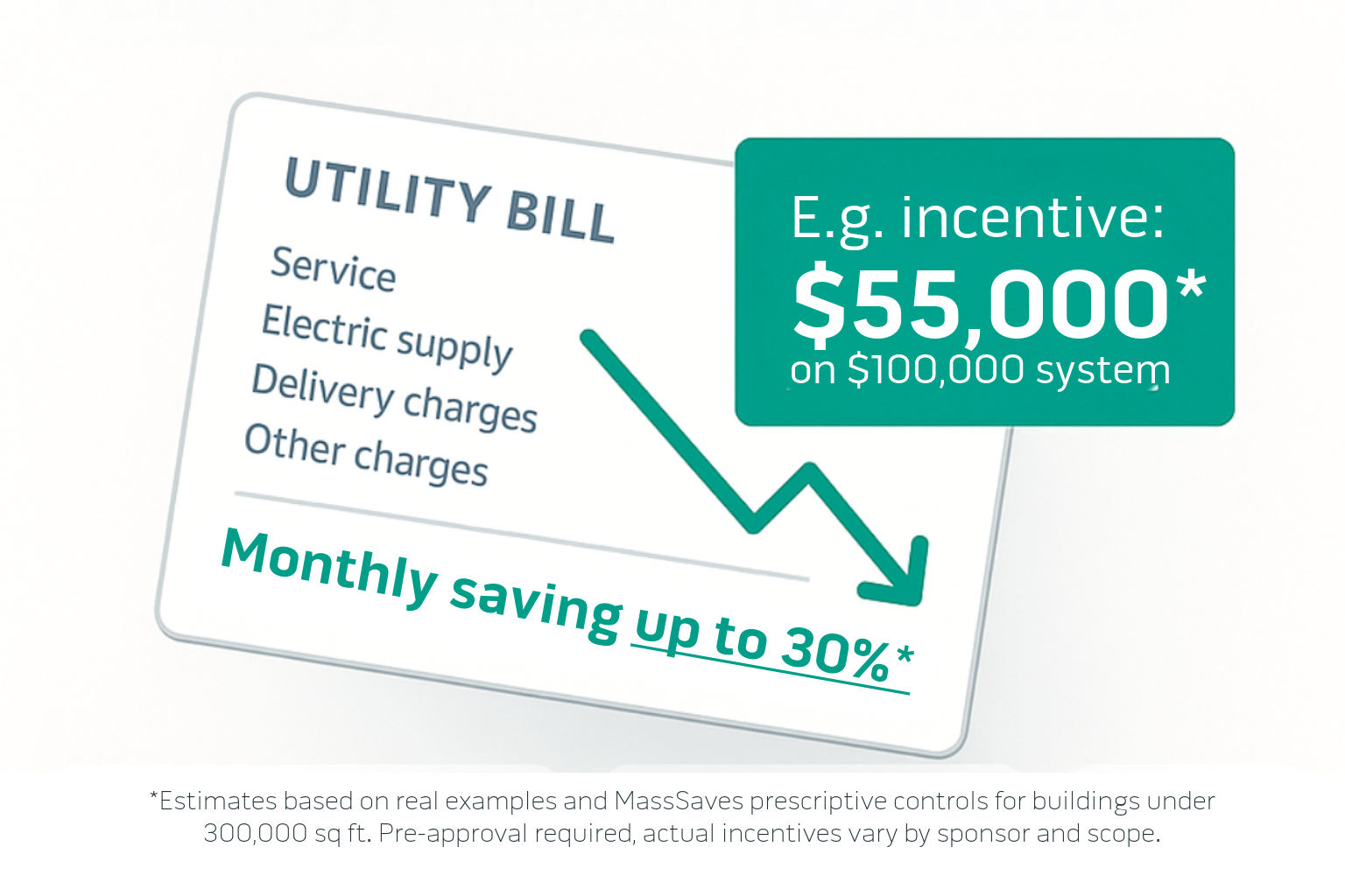 - Do we qualify for the MassSave program? Yes—most building do. Big or specialized buildings often use a custom review based on calculated savings; smaller buildings (under 300k sq ft) can use a standard, fixed-amount incentive for typical controls work. Either way, we handle eligibility and pre-approval for you.